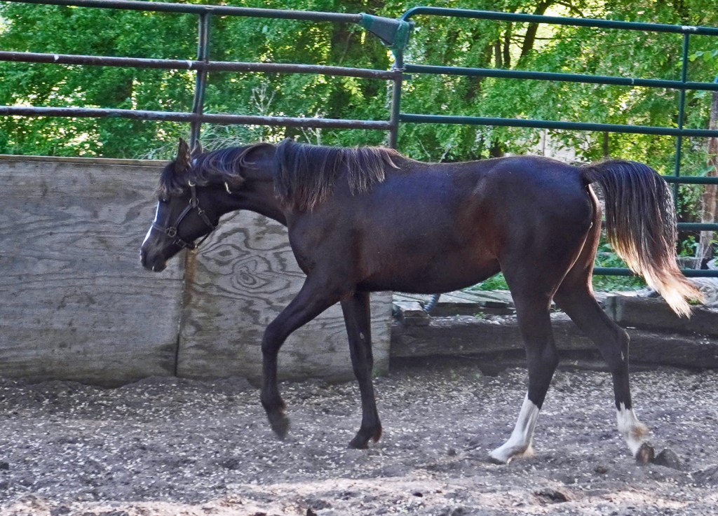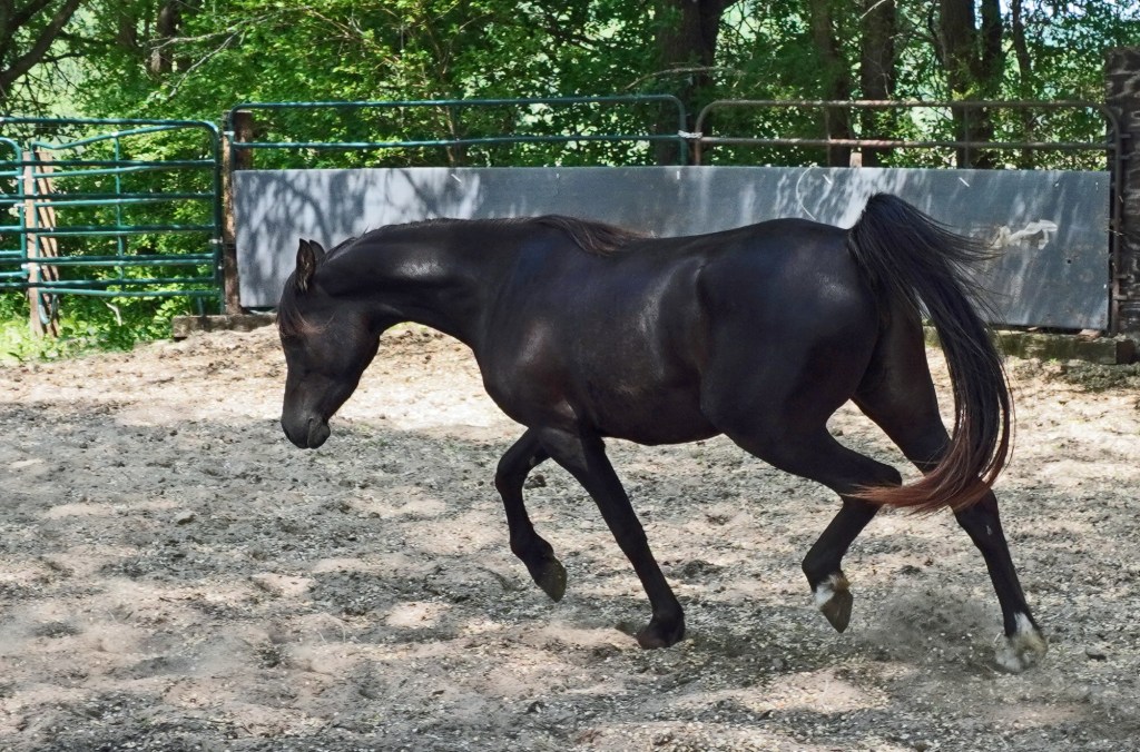 INNISHFAEL NYX – Nyx is a 2020 purebred Black Arabian filly, whose double registration with PtHA is pending. She has qualifying white on her chest, belly and both flanks. Nyx was sent to be started under saddle in June, but managed to injure herself at the Trainers. She is healing wonderfully and will be back in under saddle training this Fall.